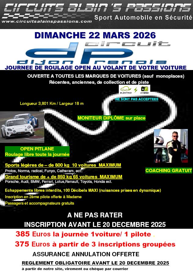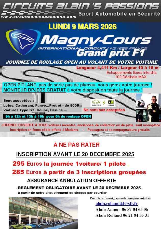| A partir de 185€ ! Attention : Plus que quelques places ! Open pitlane : Roulage libre toute la journée. Le Circuit de Nevers Magny-Cours en région Bourgogne, vous propose des locations de piste, du roulag... |  | |  |